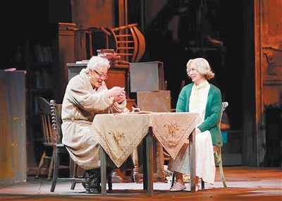 之前看过“于朱版”舞台录像,尽管画质并不清晰,但还是惊叹于前辈演员的功力。彼时中国人对养老院这种机构相当隔膜,两位演员在没有相关生活体验的情况下,成功地让一个陌生的故事与观众同频共振。台词有几处刻意又丝滑的“在地化”处理,角色魏勒与芬西雅某些时刻恍惚就是北京胡同里的大爷大妈。