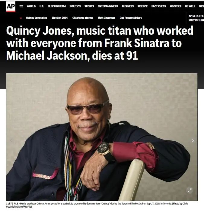 据美联社报道,当地时间11月3日,美国知名音乐制作人昆西·琼斯在洛杉矶的家中去世,终年91岁。